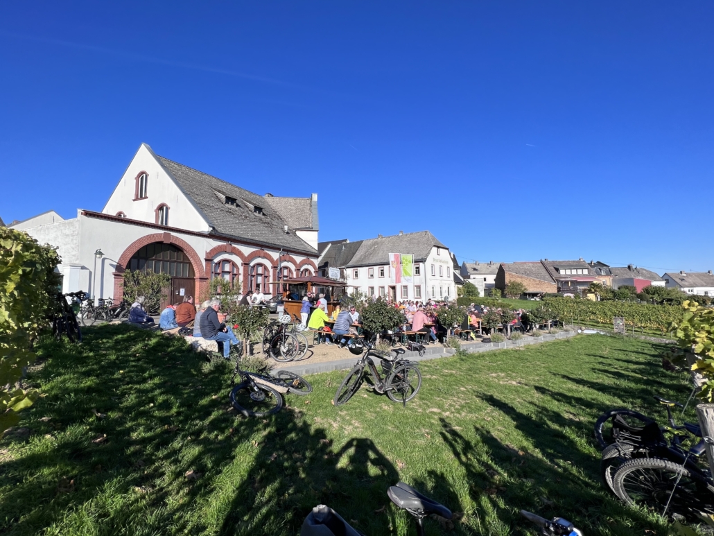 Sollte das Wetter einmal nicht mitspielen, heißen wir Sie herzlich in unserer geöffneten Kelterhalle willkommen, wo Sie in gemütlicher Atmosphäre weiter genießen können.